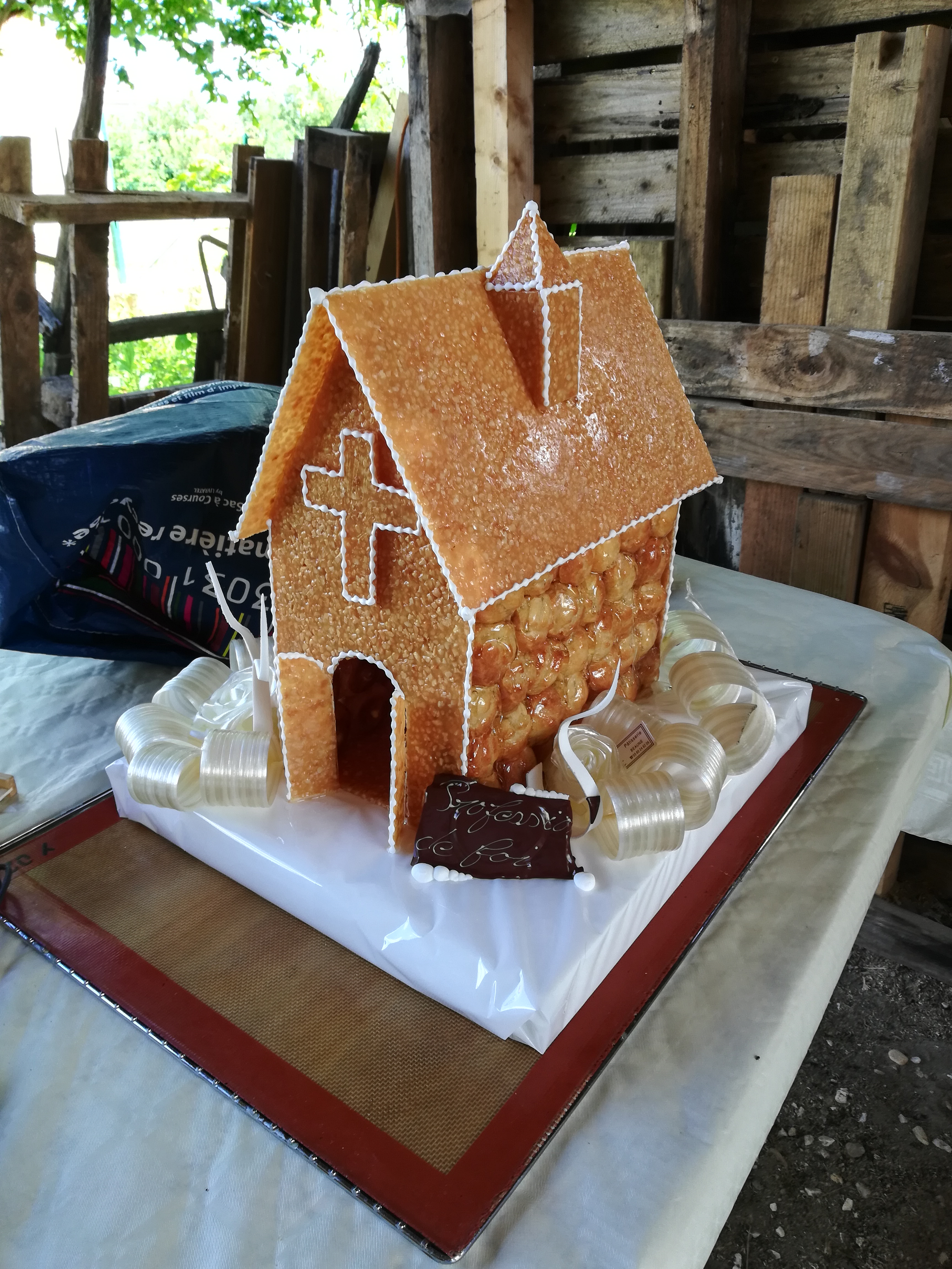 La vilaine que je suis à commander à la dernière minute une pièce monté pour 30. Belle pièce et super bonne moi qui n'aime pas en temps normal la nougatine était parfaite pas trop dur pour nos petites dents un très bon goût et croquant (bien dosé quoi) Les choux vanille excellent super bon goût cependant j'ai trouvé que les choux café avaient un peu moins de goût (on sentaient peut-être pas assez le café. Mais ça c'est plutôt personnel) la petite plaque profession de foi en pâte d'amande aurait était mieux car en chocolat... bah... ça fond. 😊 Bref aller y c'était bon et beau.