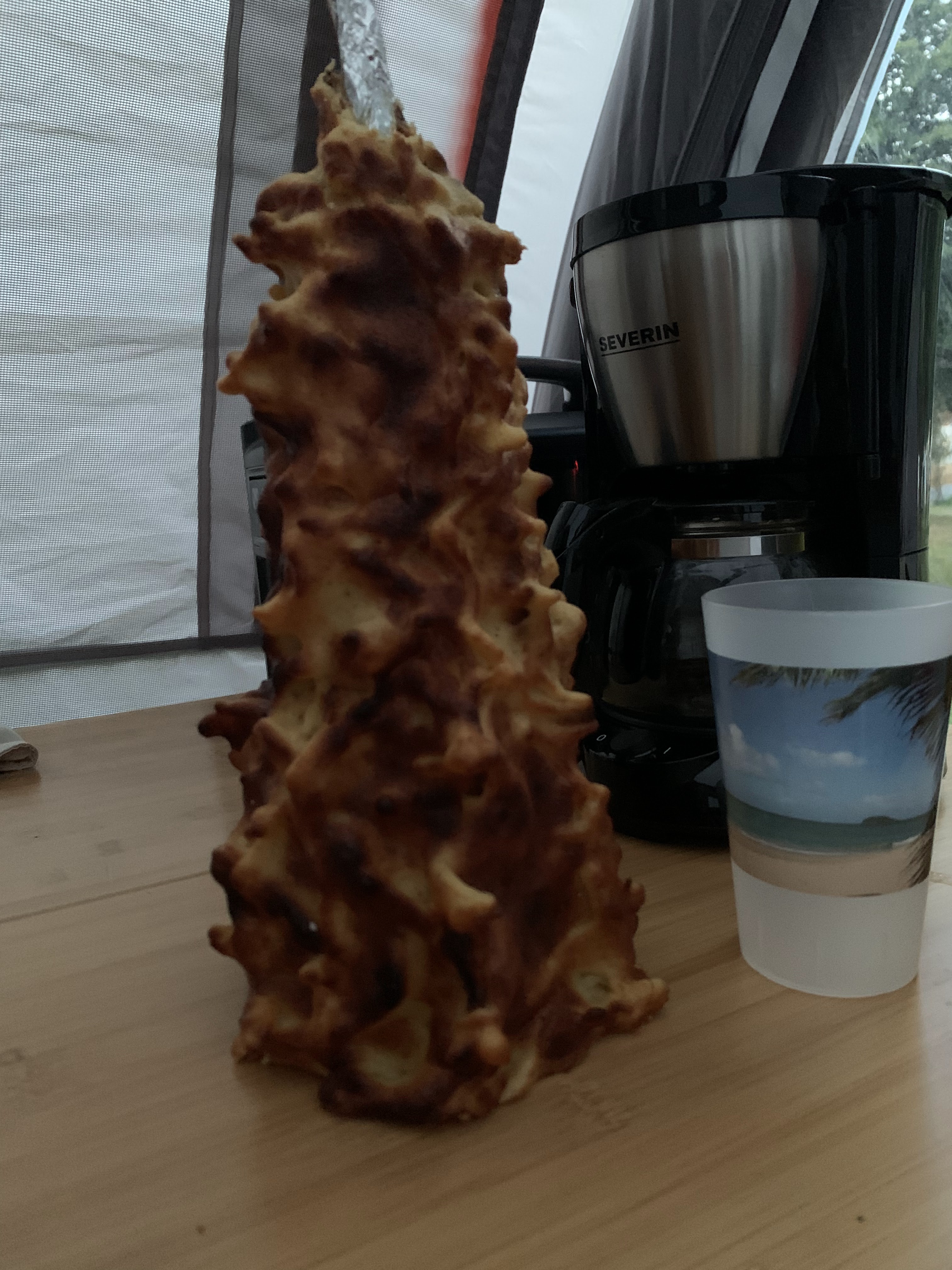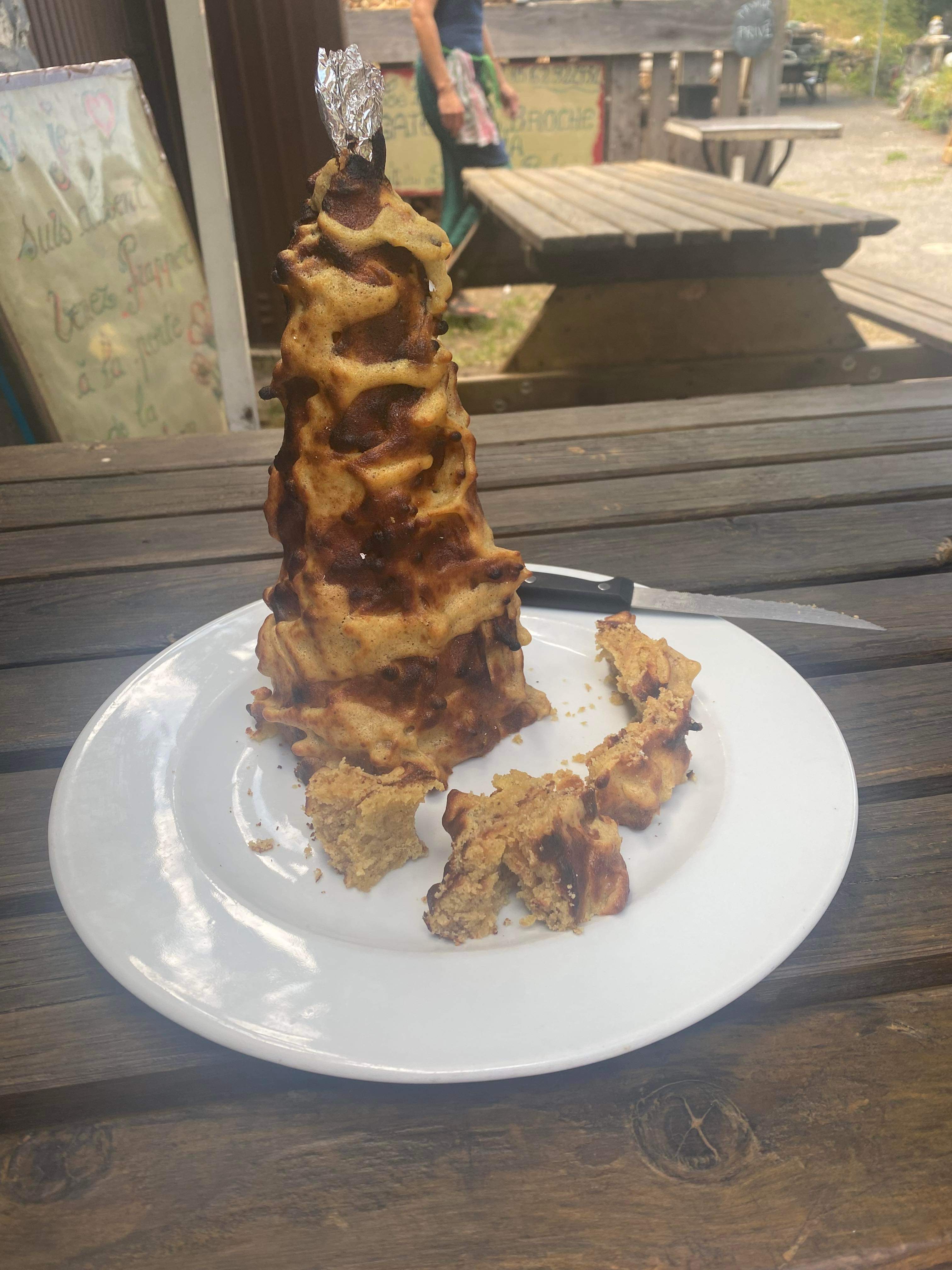 Excellent gâteau à la broche.. Je le recommande de le goûter tiède . Il est Extra : croquant à l'extérieur et moelleux à l'intérieur. Cuit au feux de bois devant soi et a déguster dans la foulée.