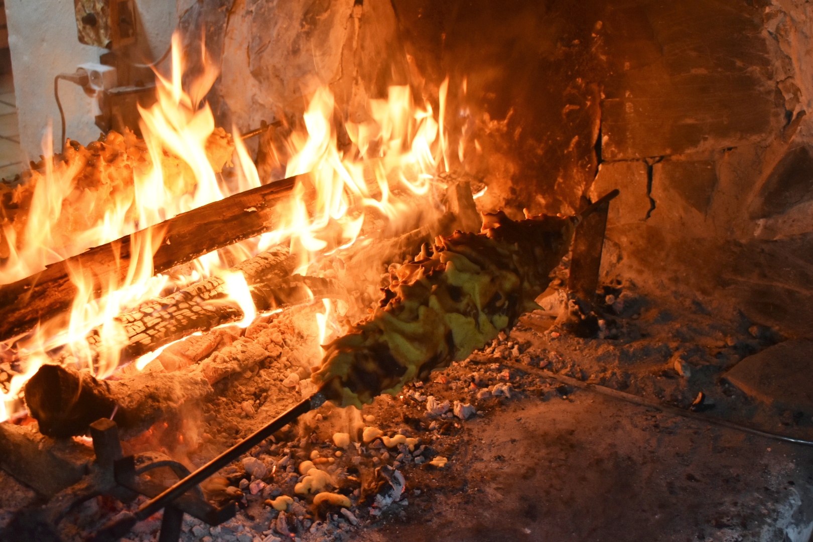 J’adore. Parce que leur gâteau est terrible bien sûr. Mais aussi pour le spectacle, cette pièce enfumée qui pique aux yeux, leur humour dont on ne se lasse pas, la broche qui fonctionne avec de vieux moteurs d’essuie-glace. Un moment hors du temps, au pied des montagnes.