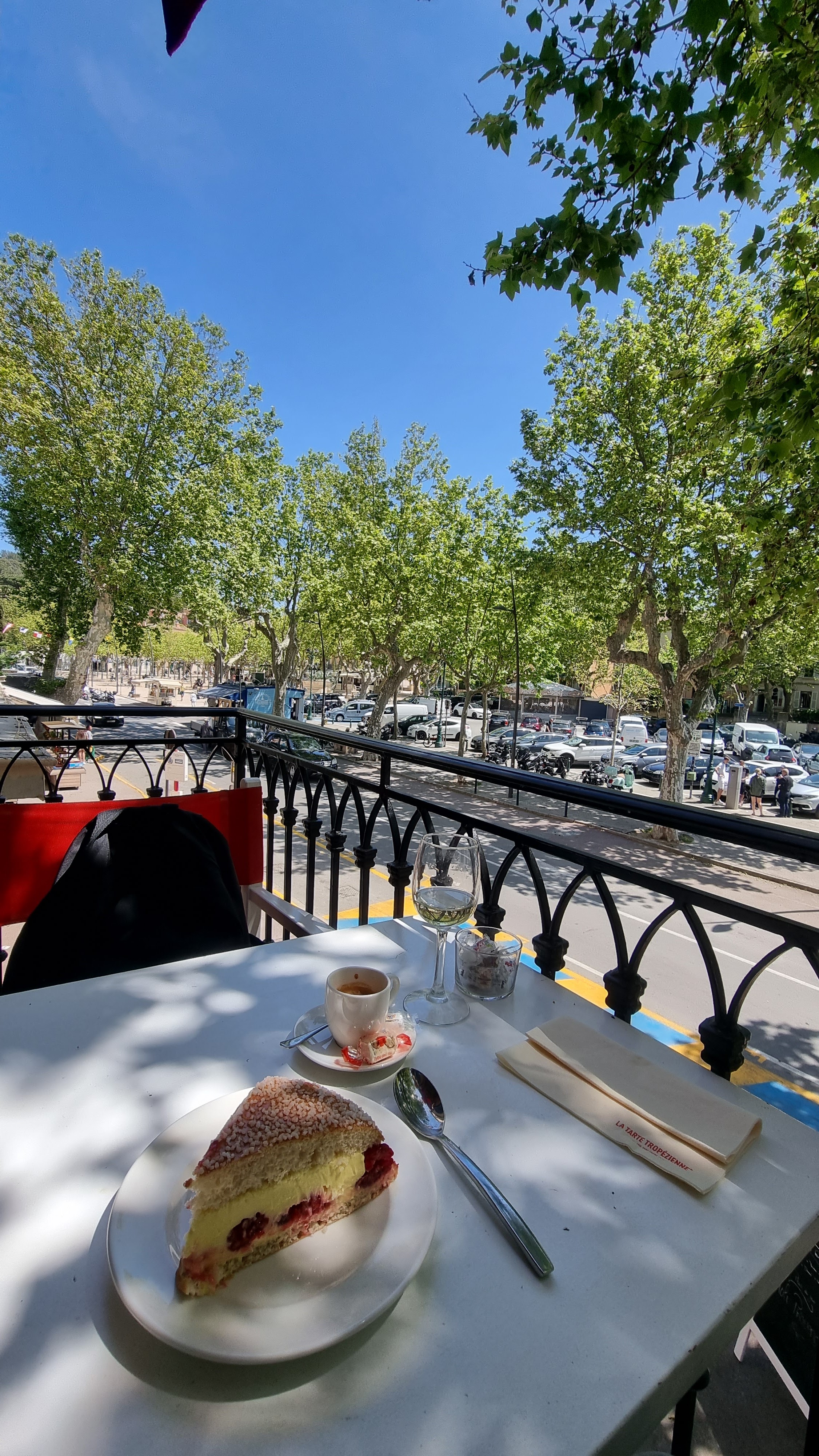 Petite table à l’étage sur le balcon avec une part de tarte tropezienne: parfait!