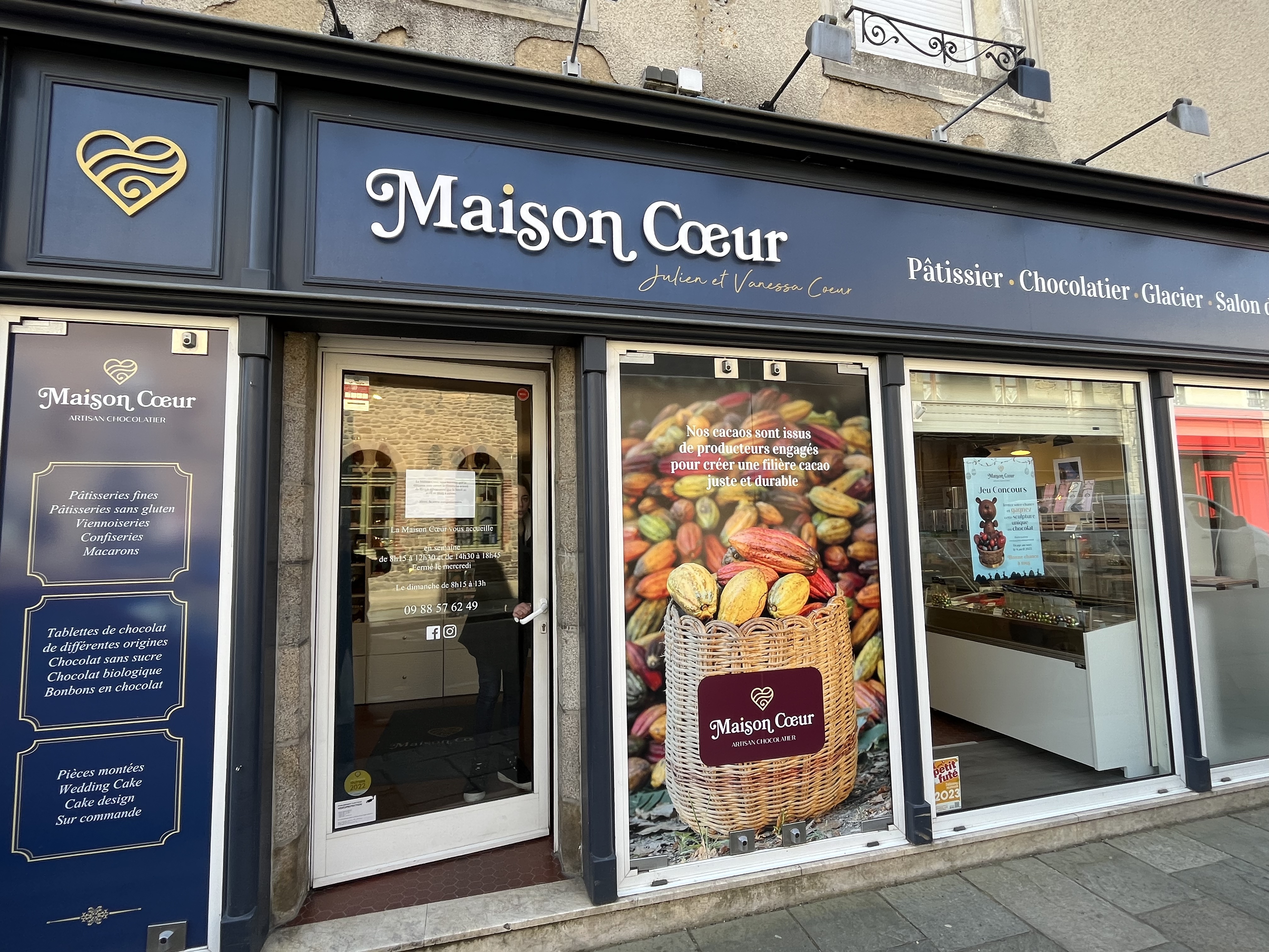 Nous sommes allés plusieurs fois à la Maison Coeur avec mon conjoint, nous n'avons jamais été déçus, nous adorons ! La pâtisserie est fine et excellente, les galettes des rois étaient délicieuses également. Concernant le chocolat... que dire? Une pure merveille, les meilleurs chocolats jamais mangés en ce qui me concerne ! Je ne m'en lasse pas. Bravo à vous et merci d'avoir ouvert cette boutique à Combourg. :)