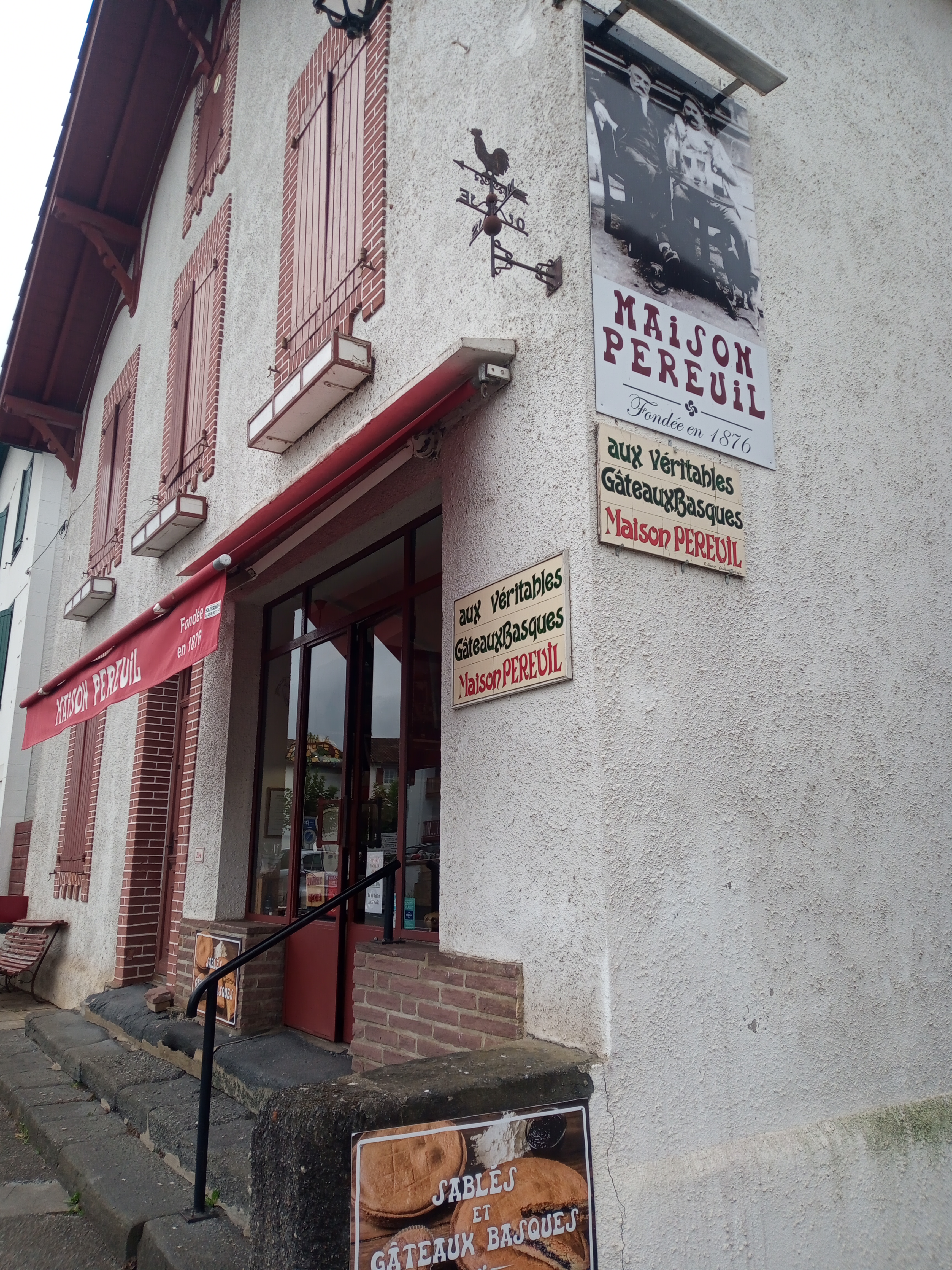 On s'est arrêté aujourd'hui le 17 mai 2023, dans cette ville pour prendre un café, juste en face, on a remarqué une façade d'une maison toute simple, dans sa partie droite, un petit magasin où c'est marquée : Maison Pereuil, fondée en 1876. Rien que la date m'a intriguée, je voulais absolument essayer leurs gâteaux basques, pour vérifier l'authenticité de l'ensemble. Alors tout s'apprêtait à me plaire : la fraîcheur, le prix, la qualité, la propreté, la décoration du magasin, et même la vendeuse très sympa. Nous avons acheté un gâteau basque aux cerises pour 6-8 personnes à 12€, un autre à la crème pour 4-5 personnes à 10€, et 2 gâteaux individuels, à 1,50€ l'unité. Verdict, c'est absolument délicieux 😋, qualité prix très très correct. Je recommande fortement