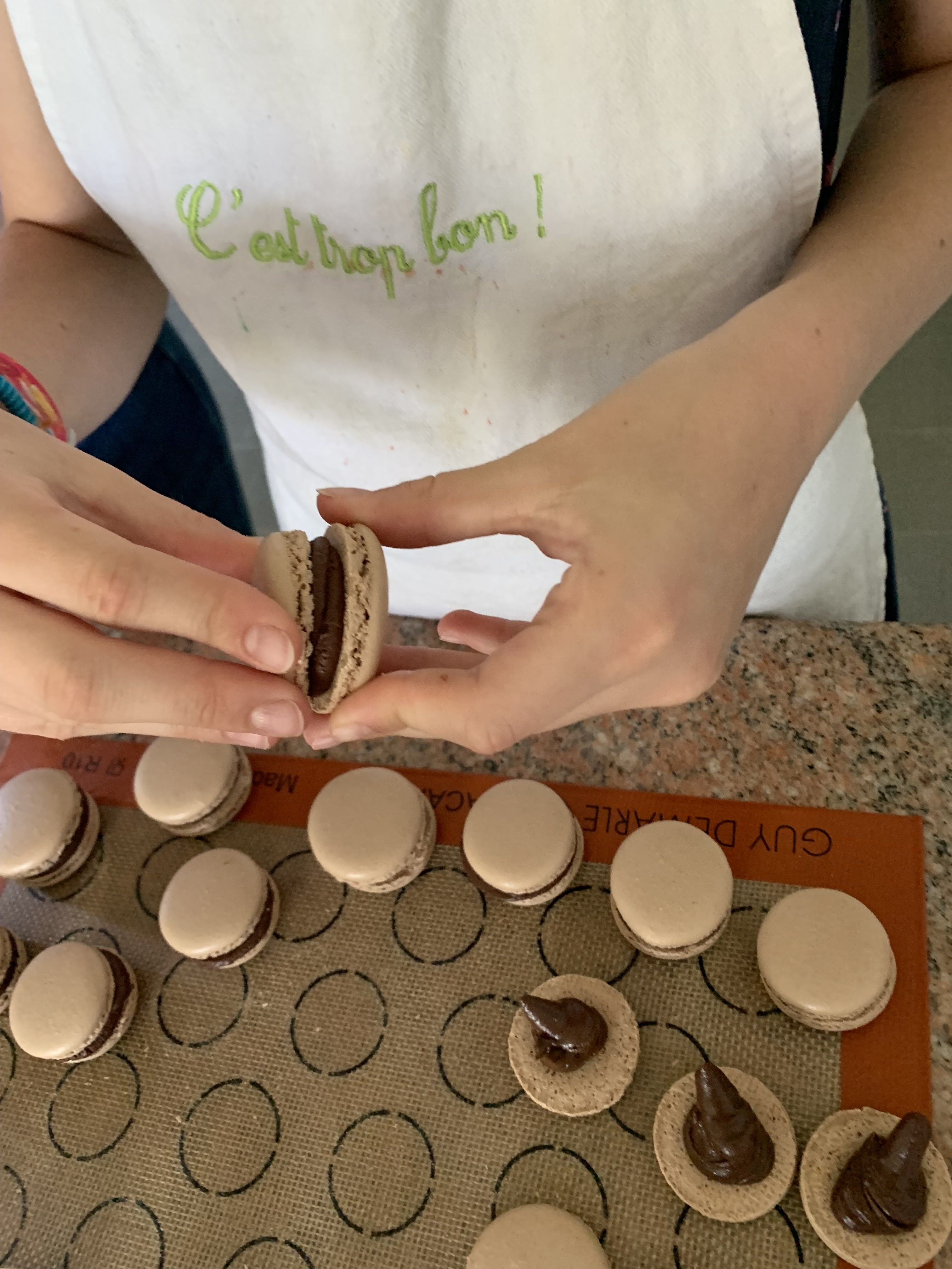 Précieux moment de partage lors d’un atelier « mère -fille » sur la fabrication de macarons chocolats et framboise. Chiara, très professionnelle, nous a transmis ses savoir-faire et bonnes pratiques dans son laboratoire dédié à la pâtisserie professionnelle. L’immersion est complète. Chiara, chef d’orchestre, met la main à la pâte si nécéssaire mais c’est nous qui sommes les pâtissières ;-) Nous avons pu réaliser 40 macarons en deux heures et demie… un vrai délice ! Merci Chiara !